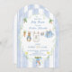 En charming Delivery från mr McGregors Garden! Inbjudan innehåller en anpassningsbar handmålad ram av ett skarpt blått lodrät rand mönster accentuerat med en lush grey wand som skapar ett rent, klassiskt och välkomnande utseende. En söt vattenfärgad klotelin stryps över mitten och visar stolt små, snygga föremål som var och en har en underlig prägel av Peter Rabbit. Scenen är fylld med en blå lunga med färska morötter och ljusa, trevliga daffodils, som alla återges i en mjuk vattenfärg stil. Lägg enkelt till dina egna detaljer och ändra typsnittet stil, storleka färg och placering om du vill. Den här inbjudan är en vacker keepy och bjuder in dina gäster till i hoppy-förväntningen på din pojke ankomst!