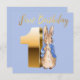 Peter the Rabbit på en blå bakgrund med guld "Första födelsedagen" text med guld nummer ett.