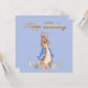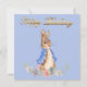 Peter the Rabbit på en blå bakgrund med guldfärgad "Grattis på födelsedagen"-text.