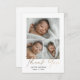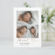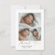 Petite Minimal Script 3 Photo Baby - tackkort. Baksidan innehåller ett meddelande från familjen. Klicka på knappen Redigera om du vill anpassa designen med foton och detaljer.