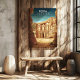 Petra, Jordan in a bold travel poster style featuring the Treasury carved into rose sandstone cliffs. Warm desert tones bring a grounded, museum-like look to a living room, office, entryway, or reading nook. A strong gift for travelers, history lovers, archaeology fans, Jordan souvenirs. Pair it with other destination canvases in your Travel Poster Canvas collection.