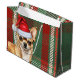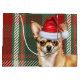 Hur söt är den här lilla Chihuahua i sin röda julklapp mot en underbar röd bakgrund och grönt säsong har en mönstrad bakgrund, skapar den här perfekten för julhelgens presentsäck till Chihuahua mamma eller hund älskare.