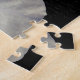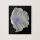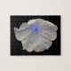 Det här fantastisk-pusslet har ett foto av en petuniablomma som har manipulerats för att göra blomglans centrum ljusblått. De yttre petalerna är vita och venerna som rinner ut från blomens mittpunkt är också ljusblå. Blomman står på en svart bakgrund för att få den att framträda.