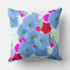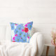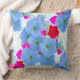 Den här dekorativ kudde-teckningen har en visning av petunia-blommar mot en vit duk med en ljuscyan, mönster med fyrkantiga linjer, vilket resulterar i en dramatisk kontrast.