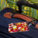 En pulserande röd, gult, svart och vit popkonsdesign av petunias.