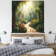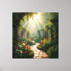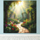 Ein zauberhafter Gartenweg, gesäumt von prachtvollen, taufrischen Rosen in Rot, Gelb, Rosa und Violett, die im goldenen Licht der aufgehenden Sonne leuchten. Diese Szene symbolisiert Frieden, Schönheit und die Magie der Natur – ein Ort zum Träumen und Verweilen.