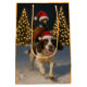 Humorous Christmas gift bag featuring a pheasant and Springer Spaniel in an apparent truce over the Christmas period! The pheasant is riding the spaniel in a snowy scene with Christmas trees twinkling in the background.