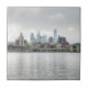 Det här är Philadelphias vackra skylin, som tagits från andra sidan floden Delaware vid vattenfronten i Camden. Skyscraperna och byggnad i Philly är på visning i detta foto. Centrala staden, centrala delen av Philadelphia, står i centrum för detta fotografi. Molnen hänger över i stormien himlar och skyscrapernas reflektioner syns i vatten.