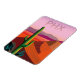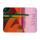 Den här designen är en contemporary som poster med ett enkelt grafiskt uttryck av ökenlandskap i varm rött, rosa och lila med saguaro cactus i förgrund. Textförkortningen "PHX" visas överst på poster och "Arizona" i vit text i grund.