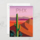 Den här designen är en contemporary som poster med ett enkelt grafiskt uttryck av ökenlandskap i varm rött, rosa och lila med saguaro cactus i förgrund. Textförkortningen "PHX" visas överst på poster och "Arizona" i vit text i grund.