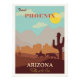 Retro vintage stil, en modern reseaffisch för Pheonix, Arizona, Förenade Stater med cowboyridhäst och digitala illustrationer av blåsilhuetets blått i skyltblått