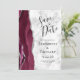 This elegant modern save the date card features a burgundy watercolor agate geode border trimmed with faux silver glitter. The black text appears on a gray and white background. Easily replace the sample image on the reverse side with a vertical photo of the future bride and groom.
