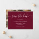 Skapa ett vackert bröllop-burgundsfoto för att spara datumkortet med ett typsnitt för eleganten. Anpassa enkelt det här fotokortet till bröllop spara datum med bildinformation och bröllop.