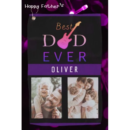 Modern, söt, coola och enkel design på svart bakgrund för Fars dag "Bästa Pappa någonsin" med modern typografi och en gitarr för ett musikälskande hjärta i modernt och trendig stil för honom och samlingar av familjefotografier. På baksidan har det inspirerande ord som är hängiven pappa att man kan ändra sig och anpassa sig efter din egen inspiration. Anpassa namn och de bästa bilderna med pappa för Fars dag eller pappa födelsedag.