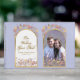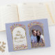 Elegant och chic av vilda blommor i lavender, dammig lila och korall med en guld-båge på bakgrunden till periwinkle. Bara så romantisk och blommigt för den speciellare dagen i ditt liv. Anpassa den med ditt foto, namn och datum.