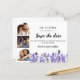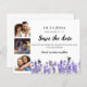 Dekoreras med vattenfärgade lavender-blommigtar. S Spara datumkortet för bröllop. Texten: Spara datumet skrivs med ett stort trendig-handskript i stil. Anpassa och lägg till tre foton. 1 lakan = 1 Spara datumet som skrivs ut kant till kant.