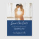 Ett Bröllop spara datum-magnetkort med marin blå bakgrund och vit text. Lägg till foto, namn, datum och stad/stat i bröllop. Fyra fält kan vara personlig att göra det till en egen.