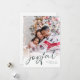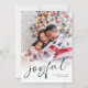 Family Photo Overlay 2026 Calendar Glatt Script jul White. Tillgänglig digitalt och utskriven. Byt bara ut exempelfotot mot ditt eget och anpassa det till ditt namn och år. Glatt finns i ett snyggt-uppspelningsskript på mörk grönt som kan ändras till ett annat färg om du så önskar. På baksidan finns en 2026-kalender för dina mottagare.