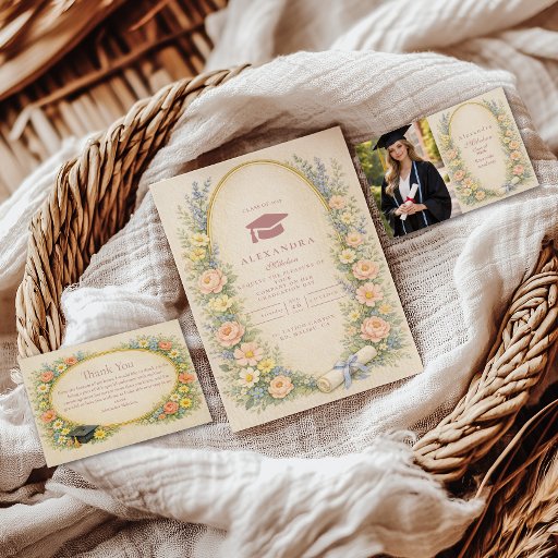 Soft, romantic and timeless, this pastel botanical graduation design features a delicate oval wreath of blush roses, buttercream blooms, and airy blue florals framed with an elegant gold arch. A subtle parchment background and refined typography create a graceful, storybook aesthetic perfect for spring or summer celebrations. Finished with a rolled diploma tied in a soft blue ribbon, it feels elegant, feminine, and heirloom-inspired. Fully customizable for name, school, date, and event details — designed to work beautifully year after year.