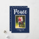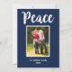 Lodräts helgdag-fotokortsdesign har en marin blå bakgrund (kan anpassas) och snyggten "Peace"-skript. Anpassa anpassningsbarna med din familj namn och år och lägg till ditt favoritfoto från porträtt (bildutrymmet är 2,25 x 3 tum). En mönster av vita snöbitar visas på kortets baksida. Fotografi © Storytree Studios, Stanford, CA