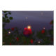 I skymningen av en sommarnatt flyter eldflugor över en ro-trädgård fylld med vibrerande röd ros.