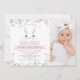 Photo Rosa Wildblommor Ungefär 1:a födelsedagsinbjudan Bunny ansikte hade en födelsedagsinbjudan med en rosa banderoll, vilda blommor, knåpa ansikte och faux glitter. Ett foto visas på högerna av inbjudan. All text är redigerbar och skapar den lämplig för alla åldrar.