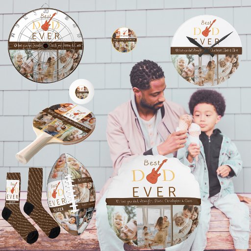 Modern, coola, unik design på vit bakgrund för Fars dag "Bästa Pappa någonsin" med modernt skript och en gitarr för ett musikhjärta i älskare i det moderna trendiget coola stil för honom. Lägg till namn och de bästa bilderna med Pappa.