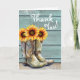 Foto Tack Rustic Land Western Solrossottkort har en vattenfärgad illustration av cowgirl-skor fyllda med solblommor med texten "Tack" i modern skripttypografi och personlig med ditt anpassningsbar- och favoritfoto på insidan. Designad av Evco Studio www.zazzle.com/store/evcostudio