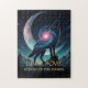 A powerful wolf silhouette filled with a vibrant galaxy texture and glowing nebula tones, surrounded by sparkling stars. A luminous moon rises behind the wolf with mountains in the foreground, creating a mystical night-sky atmosphere. Perfect for lovers of wolves, celestial art, cosmic animals, and fantasy night-scape designs on apparel, posters, and accessories.