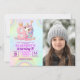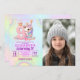 Personalized photo invite featuring a sweet unicorn illustration and pastel rainbow colors for her 9th birthday.