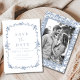 Meddela din speciella dag i stil med den här Blommigten Dusty Blue Photo Fransk Bröllop spara datum. Med vintage-inspirerade blommigtar, mjuka, dammiga blåtoner och plats för ditt favoritfoto anger eleganten tonen för ett romantiskt och tidlöst firande. Perfekt för Fransk, trädgård eller klassiskt bröllop, kombinerar sofistikering med personalisering. Anpassa med namn, bröllop-datum och plats för att skapa en viktig gäst.