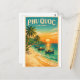 Travel poster featuring Phu Quoc Island, Vietnam, in a classic retro travel-poster style. Central focus on a tropical beach with powdery white sand, clear turquoise sea, gently leaning coconut palm trees, and traditional Vietnamese fishing boats near the shore. In the background, lush green hills and a warm golden sunset over the ocean, creating a peaceful island atmosphere. Vibrant yet balanced color palette of turquoise, emerald green, sandy beige, and sunset orange. Clean graphic illustration with subtle vintage grain texture. Elegant vintage typography: “PHU QUOC – VIETNAM”. Vertical 2:3 layout, high-resolution, print-ready.