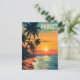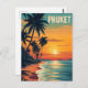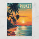 Denna vackra vintage affisch visar Phuket vid solnedgången. Silhouetted handflatan träd sträcker sig över en gyllene strand när himmel glor i varma reflexer av orange och rosa. Den nostalgiska paletten struktur och vintage färg fångar kärnan av ett fredligt thailändskt paradis, perfekt för att väcka andan av halvsekelresande och exotisk avslappning.