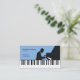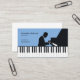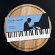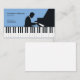 A business card for a piano teacher or a pianist. It comes with black & white piano keys and a silhouette of a man playing the piano, all on a blue background.