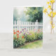 A white picket fence with flowers adorn this card. Text inside can be changed. Image is AI-generated by IveyCottage.