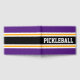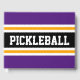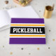 Den här sportiska designen har en atletisk PICKLEBALL-text inuti ett stort svart vågrät i mitten av tävlan rand med intilliggande ljus gyllene gult och vita ränder mot royalets lila yttre ränder i kant. Färg och text i den här utformningen kan vara personlig.