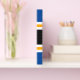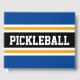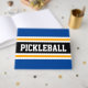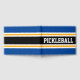 Den här sportiska designen har en atletisk PICKLEBALL-text inuti ett stort svart vågrät i mitten av tävlan rand med intilliggande ljus gyllene gult och vita ränder mot feta blå yttre ränder i kant. Färg och text i den här utformningen kan vara personlig.