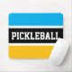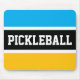 Den här sportiska, färgstarka designen har en atletisk PICKLEBALL-text inuti ett vitt svart rand som markerats med vita ränder mot ljusblå azyrblått och gult orange bakgrunder.