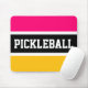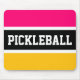 Den här sportiska, färgstarka designen har en atletisk PICKLEBALL-text inuti ett vitt svart rand som markerats med vita ränder mot bakgrund av ljusa rosor och gulter för orange.