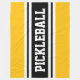 Den här sportiska designen har en atletisk PICKLEBALL-text inuti ett markerat svart rand med intilliggande dubbla vita ränder mot en ljus gult av orange. Färg och text i den här utformningen kan vara personlig.