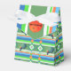 Pickleball paddles & orange bollar väntar på att spela på en grönt domstol som är försedd med gröntar, blues, vit och orange rand och diamanter. Roligt pickleball-themed party förser din favoritpickleball-spelare med födelsedag, den där rec-ligans postertur i slutet av säsongen, bakbäcksbarbeque, pickleball kompiscookout eller snackande på disken. Pickleball party favors för att anpassa dig med din favoritspelare i namn.