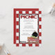 Bra inbjudan för picknick eller grillfest. Inbjudan har ett picknickbord fullt med hamburgare, majs på kolven och en vattenmelon. Grill och myror i bakgrunden.Anpassa ditt meddelande för tillfället.