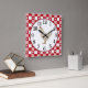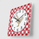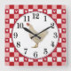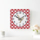 10,75" x 10,75" akrylväggklocka med en bild av ett rött, rosa och vitt schackbräde med vita kycklingar och tuppar, som påminner om en picknick bordduk av land. Lätt att läsa den runda vita klockan har ansikte röd gräns och bild av en höna. Visa hela samlingen med den här och den där klockan i avsnittet HEME.