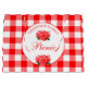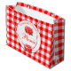 Gör dina pickniska gåvor från party speciella med den här glansigt röda gingham-handbagaget i mönster. Anpassa med en familj namn och picknicker eller ord till kostym i tillfälle.