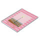 Journal har en rosa argyle mönster-bakgrund och en rosa-färgad fotoinfogning av en pierlampa som är vänd mot havet.