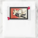 Pantomimes popularitet i slutet av 1980-talet ledde till att ledsen clown Pierrot återuppstod. Här är ett rektangulärt klistermärke som matchar vår "Pierrot’s Masqueraad"-inbjudan med en bild av ett grått- och vitt schackerbord och ett vintage bild av en maskerad Pierrot och hans kärlek Columbine på en röd och vit abstrakt med svart gräns. Se matchande inbjudan, kuvert, presentens märkre, etikett och omslag pappert. Visa hela Tubular 80s-taggarsamlingen i INBJUDAN | Avsnittet Stickers & Labels.