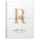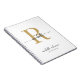 Modern, chic, elegant vit och guld monogram initial bokstav feminint signatur skrivet spiralblock. Denna enkla minimalistiska enfärgade design med förnamnet i en vacker handskriven stil svart svans typsnitts typografi med guldmonogram initial, fullständigt namn och textradsmall på vit bakgrund. Lätt att anpassa dem. Fantastiskt personligt och skräddarsytt present för tjej på födelsedagsfest, inflyttningsfest, bröllop, SÖTA 16 födelsedagsfest, brudvisning, BABY shower, skolstart, företag, yrke och för alla som älskar vacker elegant minimalistisk stil.