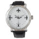 This design features a variety of black airplane silhouettes on the main clock numbers (12, 3, 6, 9). At the center of the watch is a black silhouette of an airplane propeller. Make a great birthday, anniversary or just because present for pilots and aviation lovers. Embrace the spirit of aviation on your wrist and let every glance remind you of the skies.