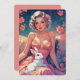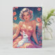 En fantastisk illustration av en pin-up i en blommande rosa klänning som håller en söt vit kanin. Hennes retrofrisyr, prydd med rosa blommor, kompletterar den frodiga blomsterbakgrunden i teal och rosa nyanser och fångar påskens charm med vintageelegans.