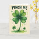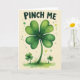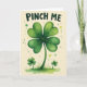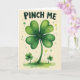 This card features a large emerald-green four-leaf clover centered on the front, its heart-shaped leaves shaded from deep forest tones to lighter, glowing edges like watercolor washes. Beneath it, two smaller clovers rise from a soft sweep of green grass, leaning slightly toward each other as if sharing a quiet, friendly moment 💚. The background is a warm, creamy off-white that keeps the greens feeling fresh and cozy. Scattered around the scene are loose paint dots and splatters in lime, olive, and darker green, adding a casual, celebratory energy ☘️. Near the top, the words “PINCH ME” sit above the clover in rounded, dark green letters that stand out clearly against the pale backdrop. The mix of smooth leaf shapes and drifting speckles gives the whole layout a breezy, hand-painted look. Tiny dark flecks are sprinkled between the green splashes, with the densest cluster hovering around the central clover.